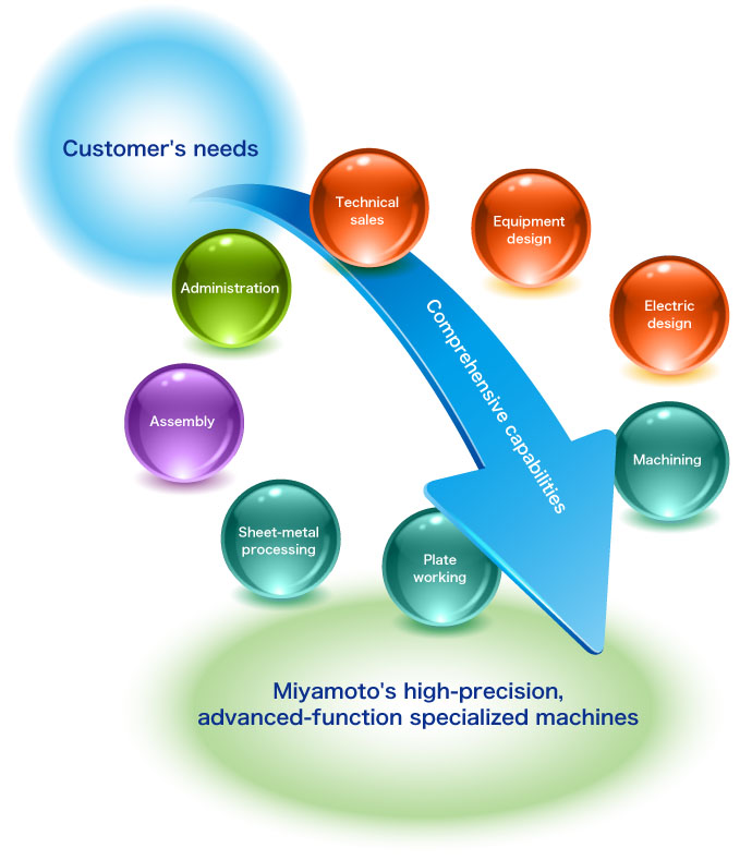 We examine the needs of each customer and provide machines that offer high precision, advanced functions, excellent durability and ease of maintenance. Even if your needs call for the development of complex, high-precision equipment that are too challenging for other companies, you can count on us. |