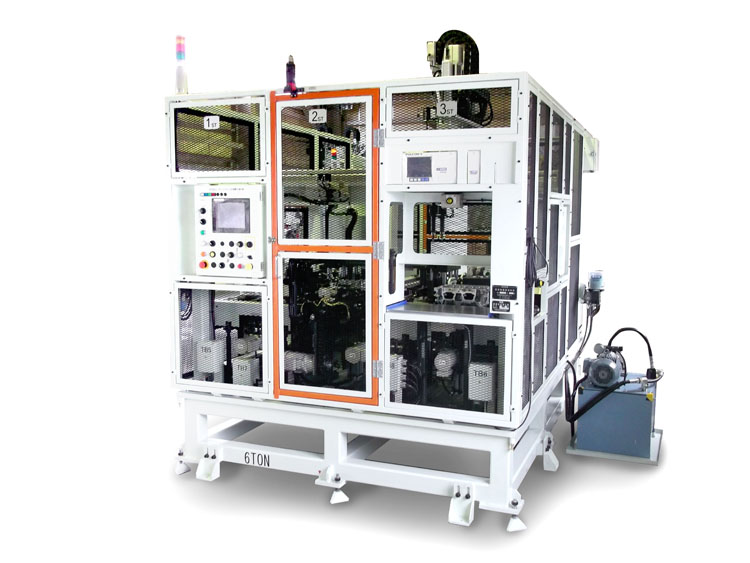 シリンダヘッド にバルブガイド及びバルブシートを常温で上下同時に圧入を行います。全ての動作軸がNC 制御となっている為、ピッチ・角度等違うワークに段取りにて対応が可能です。